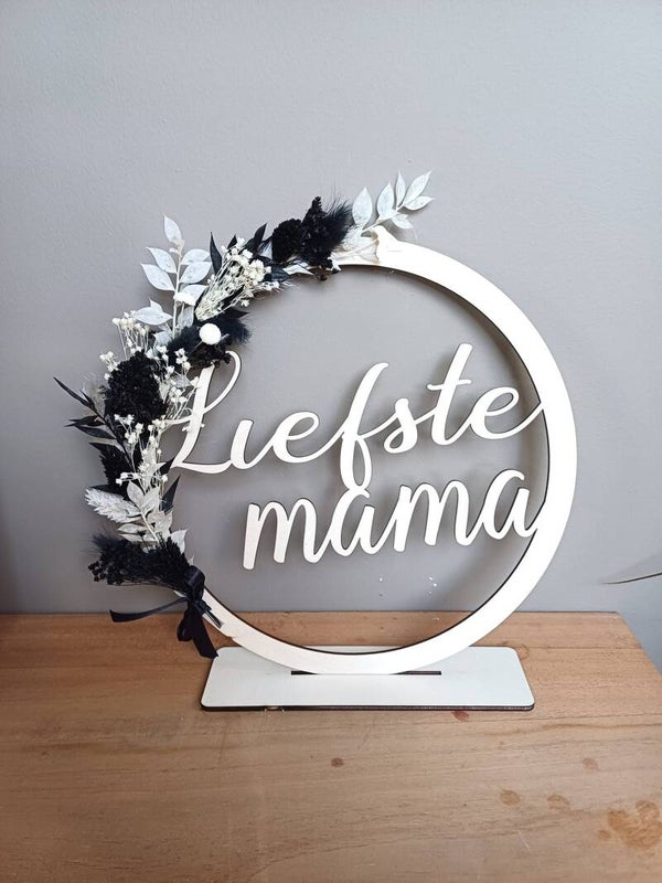 Houten krans met tekst en droogbloemen om moederdag of een andere speciale dag te vieren.