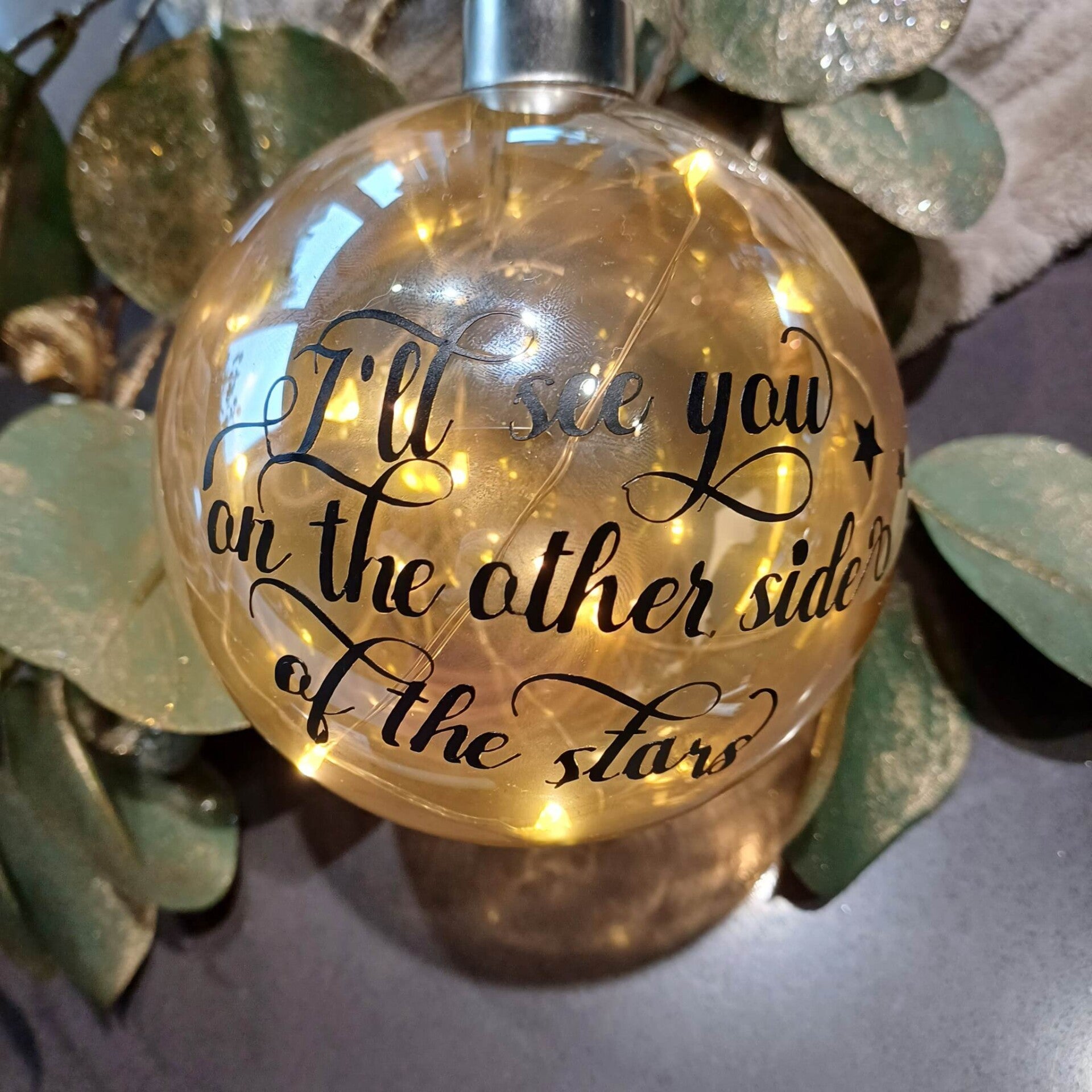 Bronskleurige glazen kerstbal voorzien van een koestertekst.