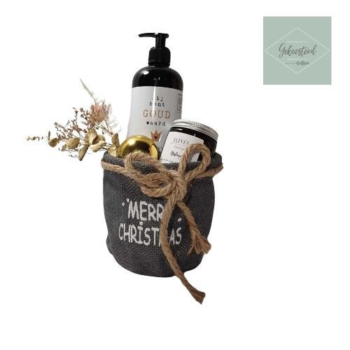 Een heerlijke luxe geurkaars , een kerstbal met droogbloemen en handzeep voorzien van tekst.