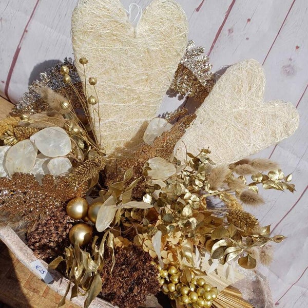 Mag jij dit samen met iemand vieren dan is dit goudkleurig bloemstuk voorzien van 2 harten een ideaal geschenk.