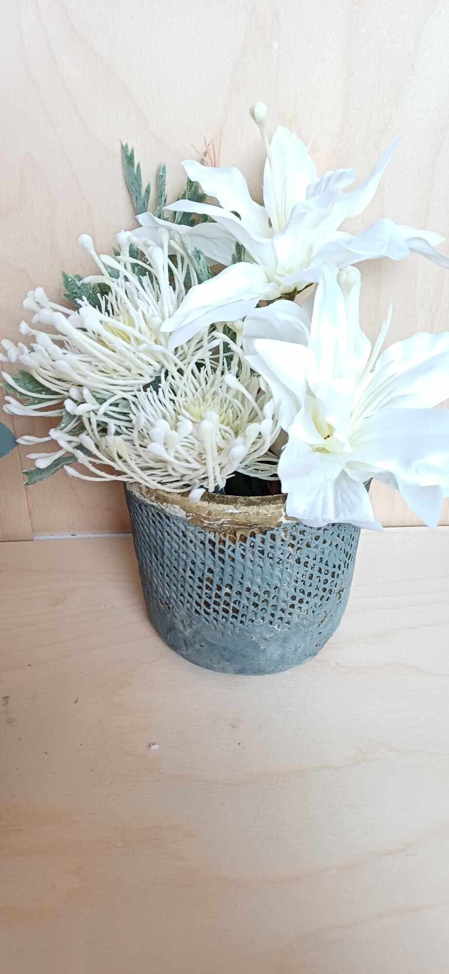 Zijdebloemen in een stevige bloempot geschikt voor het kerkhof.