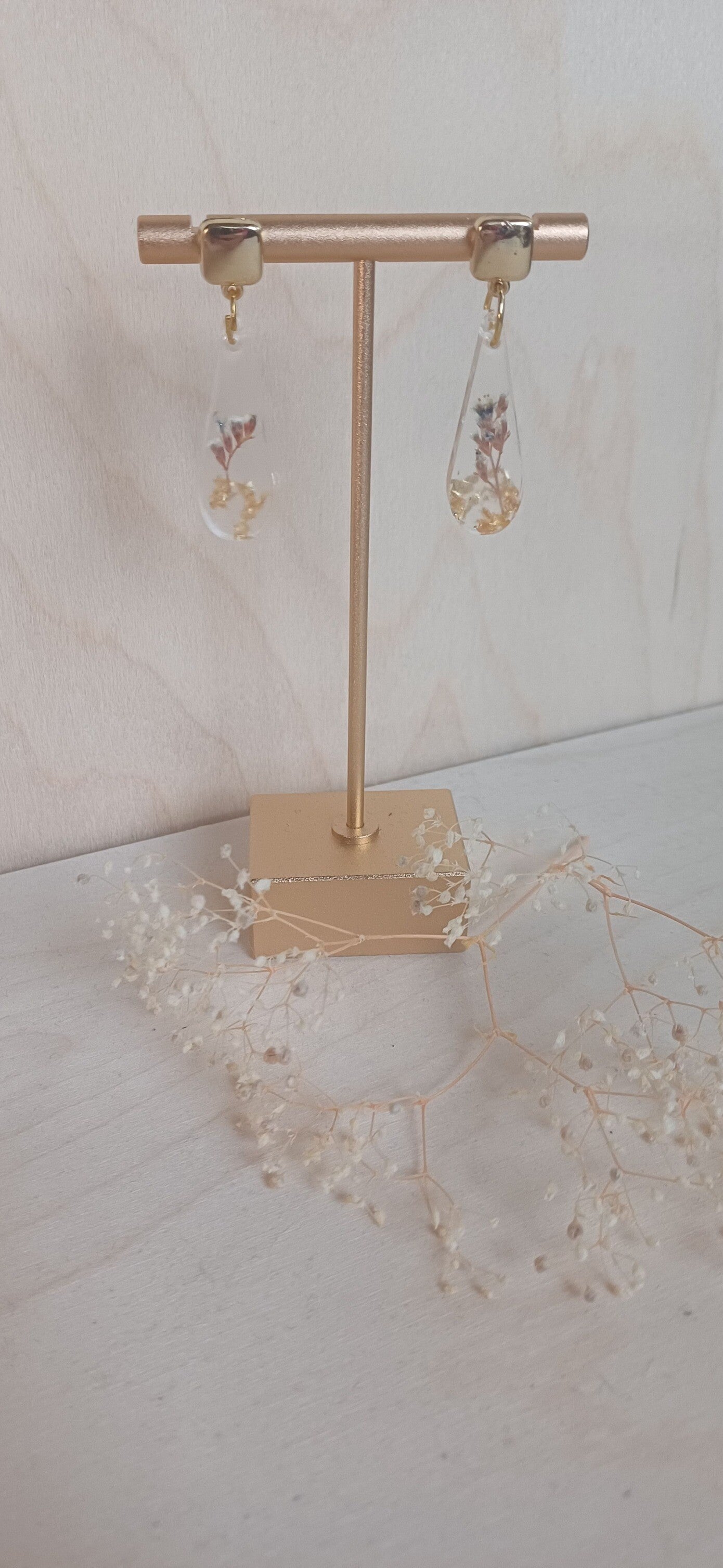 Handgemaakte oorbel met droogbloem.