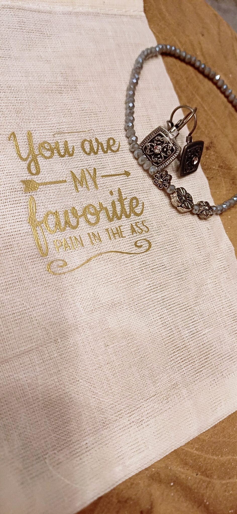 Leuk zakje met tekst voorzien van een juwelensetje in grijs en zilver.