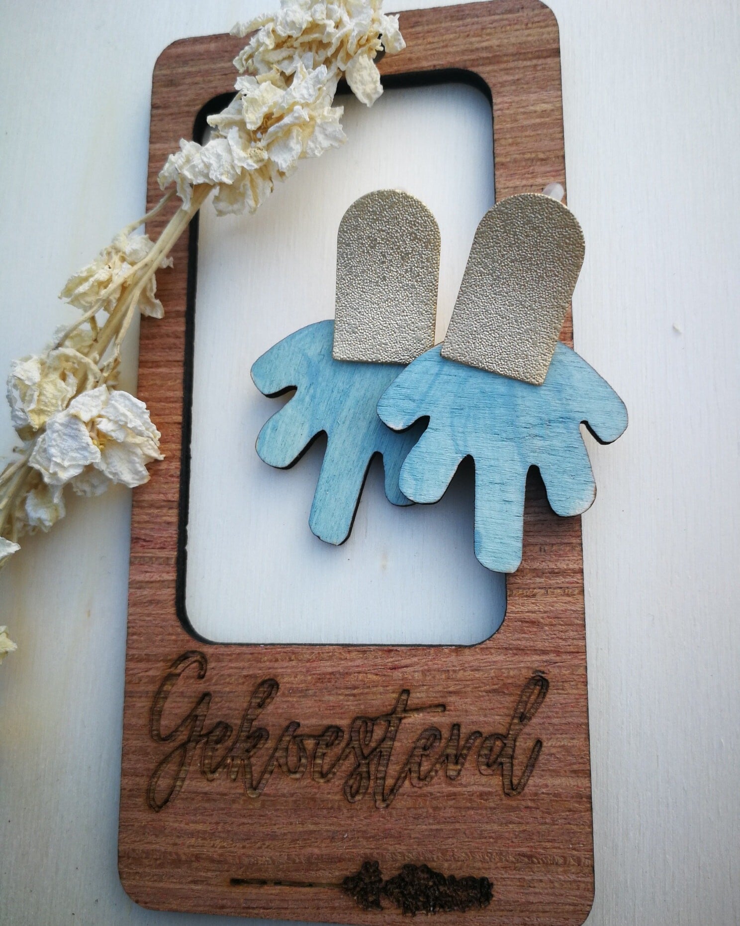 OOrstekers in goudkleur voorzien van een grappige blauwe houten vorm.
