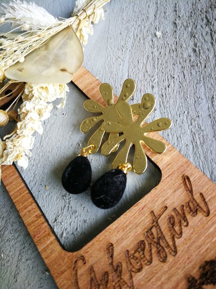 Oorbellen met een goudkleurige bloem voorzien van een zwarte druppel.