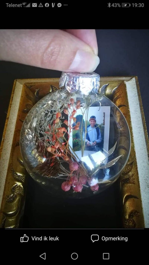 Deze glazen kerstbal is gevuld met droogbloemen en een foto van een geliefde.